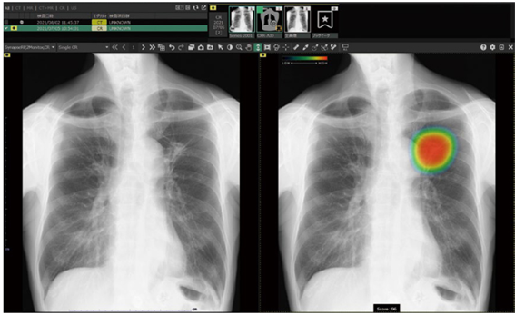 胸部(肺)のレントゲン画像内の腫瘤や気胸等の病気を検出し、見落とし防止を支援するAI技術を活用したシステムです。